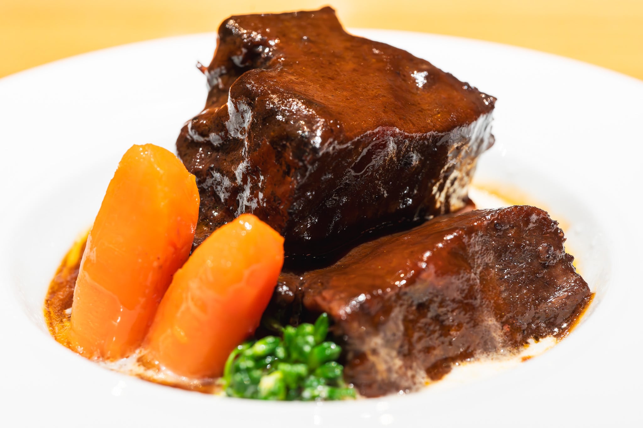 香味野菜でじっくり煮込んだ最高峰の尾崎牛 100%。肉の旨みを逃さないよう、たっぷり の赤ワインで36時間のマリネの後、60時間をかけて煮込みと熟成を繰り返すことで旨味を引き出します。ハーブと赤ワインの芳醇な香りと香味野菜の甘味を湛えたソースに仕上げ、尾崎牛は塊で柔らかく煮込みました。口いっぱいに広がる豊かなコクと、柔らかいけれど食べ応えのある絶妙な肉肉しさを残す煮込み加減が尾崎牛を引き立たせます。大変深みのある一皿です。